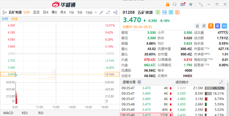6月4日,五矿资源(01208)复牌,早盘低开。截至发稿,跌9.16%,报3.47港元,成交额1.731亿港元。