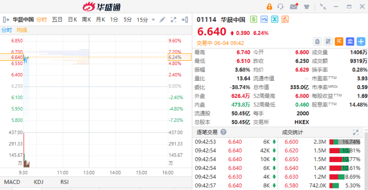 6月4日,华晨中国(01114)早盘走高,截至发稿,涨6.24%,报6.64港元,成交额9319万港元。