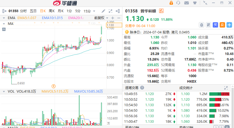 普华和顺(01358)早盘股价上涨10.89%,现报1.12港元,成交额420.47万港元。