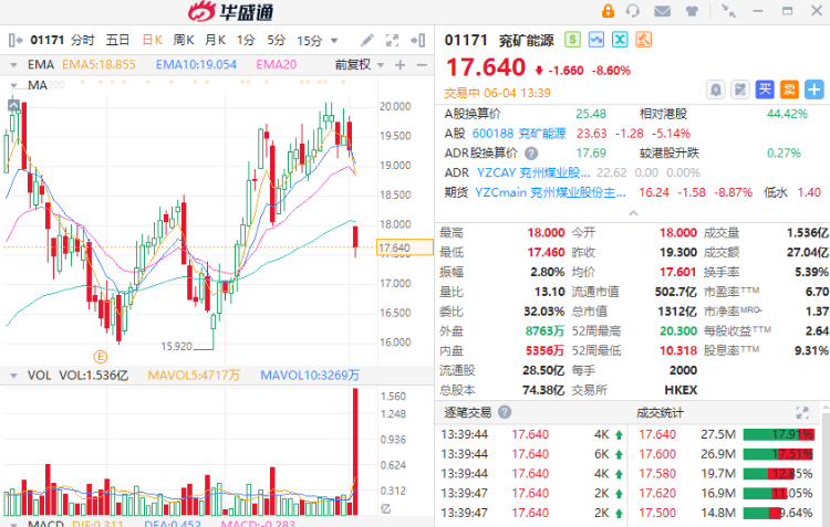 受配售公告影响,兖矿能源(01171.HK)在今日开盘即走低,盘中一度跌超9%。截至发稿,跌8.60%,报17.64港元。