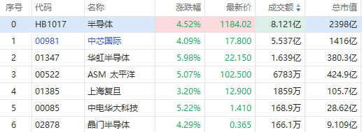 截至发稿,脑洞科技(02203)超50%,宏光半导体(06908)涨超15%,华虹半导体(01347)涨6%,上海复旦(01385)涨超3%,中芯国际、晶门半导体涨超4%。