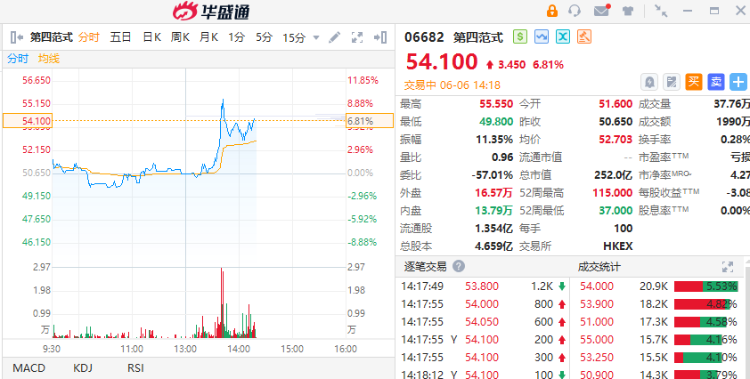 6月6日,第四范式(06682)午后一度涨超9%,截至发稿,涨6.81%,报54.1港元,成交额1990万港元。