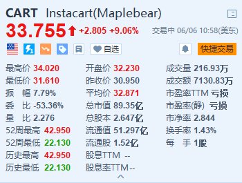 美国食品杂货配送公司Instacart(CART.US)涨超9%,报33.755美元。消息面上,Instacart董事会批准了一项股票回购计划,授权回购最高达5亿美元的公司普通股。在此之前,Instacart已经使用之前的授权回购3400万股普通股,没有剩余回购额度。