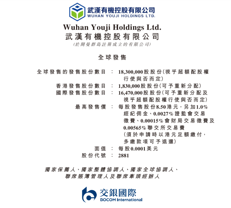 华盛资讯6月7日消息,武汉有机(02881.HK)今起招股,前往新股中心,申购新股>>