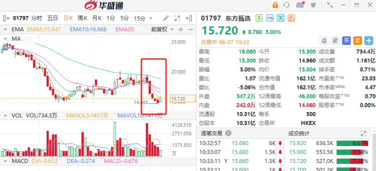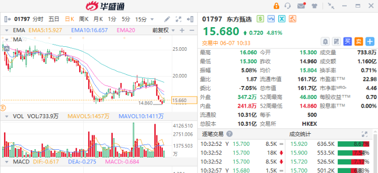 东方甄选(01797.HK)在5个交易日连跌,累计跌幅超20%后反弹。截至发稿,涨5.75%,报15.82港元。