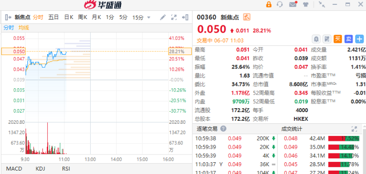 6月7日,新焦点(00360)拉升逾28%,昨日尾盘收涨近40%。