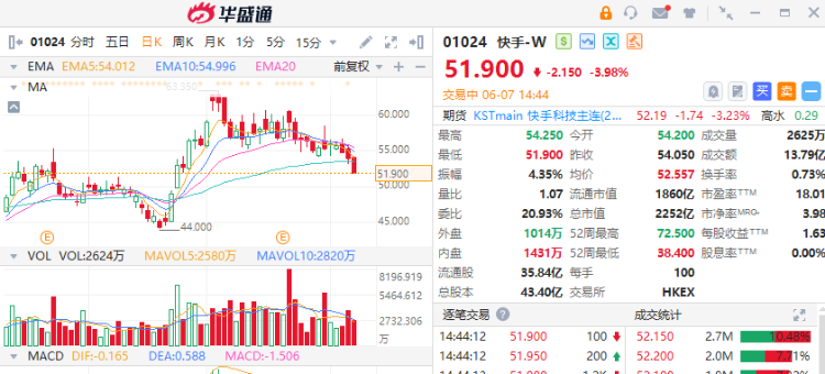 周四快手(01024)旗下的「可灵」AI生成影像模型正式发布并继续发酵,不过快手近日股价走弱,最新跌3.98%,报51.9港元,至今经已连跌四日。轮场方面投资者或趁股价跌而积极追买入快手的相关好仓产品。