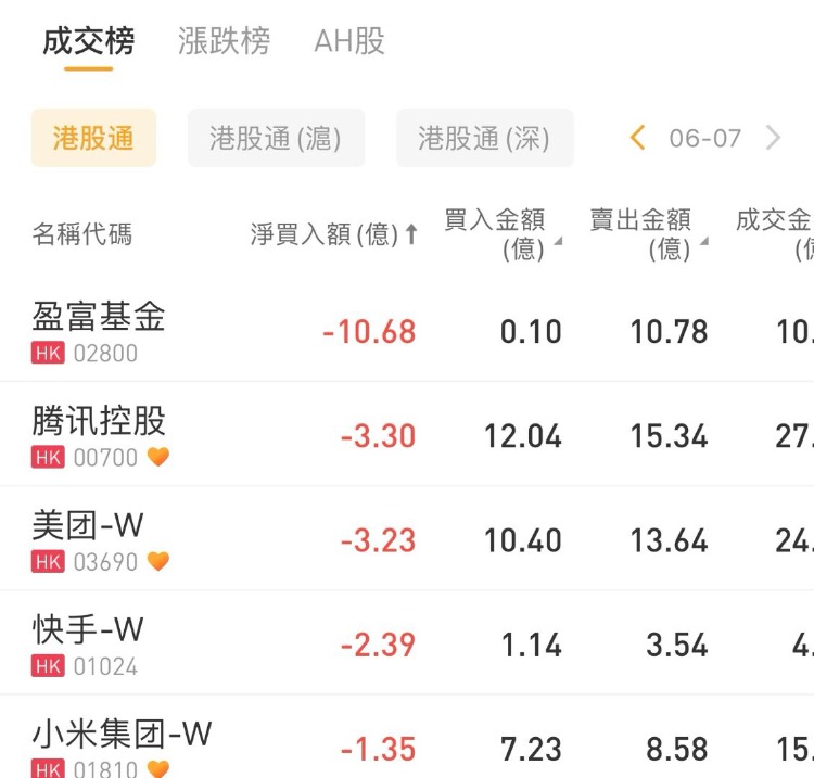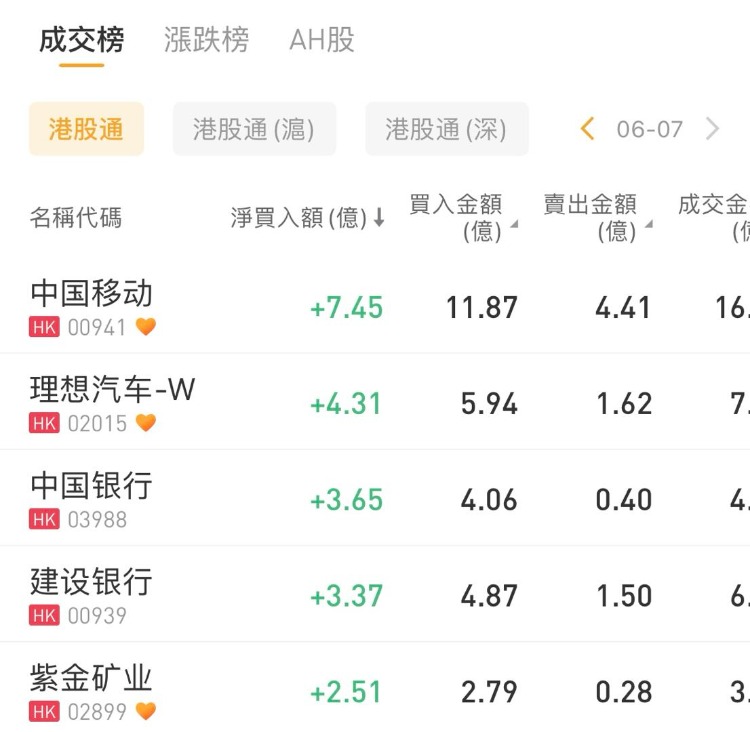其中,南向资金净买入中国移动7.45亿港元、理想汽车4.31亿港元、中国银行3.65亿港元;净卖出盈富基金10.68亿港元、沽出腾讯控股3.3亿港元,甩卖美团-W3.23亿港元。