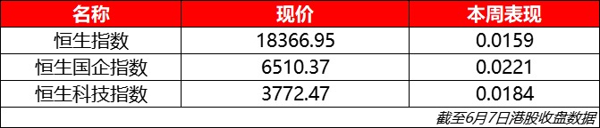 本周恒生指数涨幅1.59%,报18366.95点;恒生科技指数涨幅2.21%,报3772.47点;国企指数涨幅1.84%,报6510.37点。