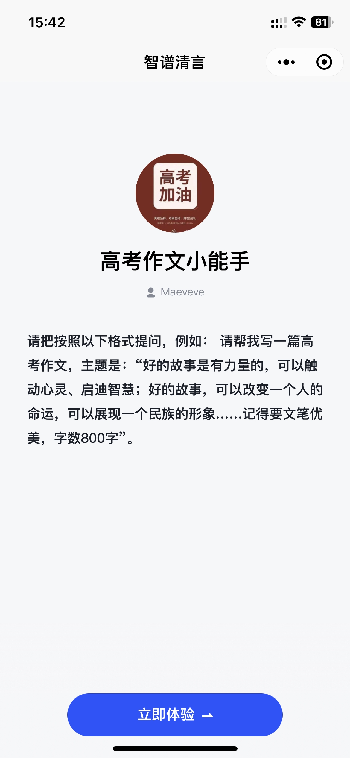 在2024年高考中,智谱清言就直接推出了高考作文专用的“智能体”,考生在小程序就可以打开,并且可以直接选择聊天记录,可以说很方便学生们考后直接在微信开展对题大讨论