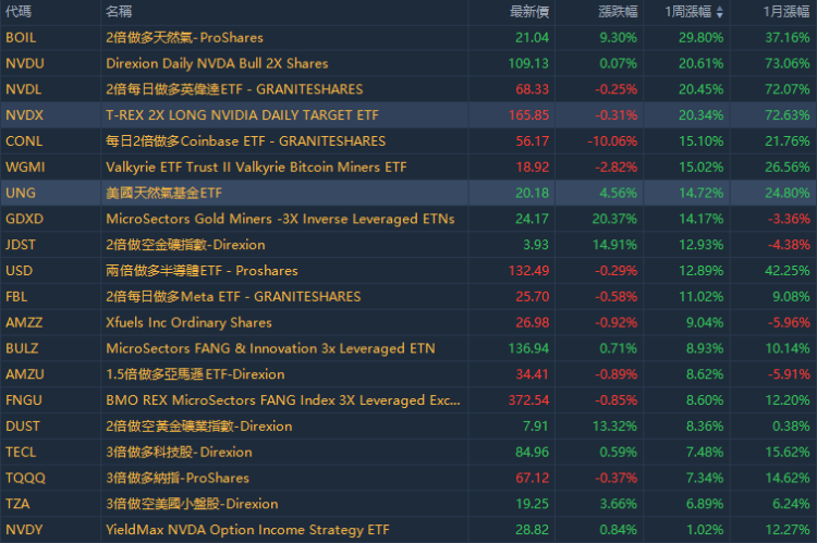 除英伟达的杠杆ETF外。做多科技股和做多亚马逊、Meta等ETF表现亮眼。其中 $USD 涨近13%、$FBL 周升11%、 $AMZU 累涨8.6%、 $TECL 周涨7.48%。