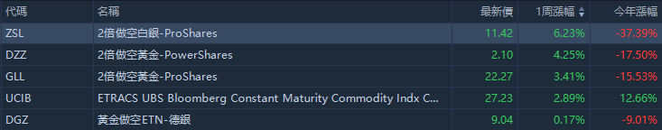 大宗商品ETF方面,2倍做空白银ETF $ZSL 本周以6.23%强势涨幅录得榜首。此外,本周做空黄金ETF表现较好,2倍做空黄金ETF $GLL 涨3.41%