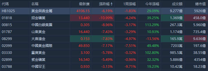 黄金股集体低开,截至发稿,招金矿业跌近11%;中国白银集团跌5.96%;山东黄金跌7.43%;中国黄金国际跌7.17%;灵宝黄金跌5.78%;紫金矿业跌超5%。
