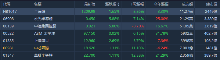 芯片股逆市上扬,宏光半导体(06908)涨5.88%,ASMPT(00522)涨3.02%,上海复旦(01385)涨2.69%,华虹半导体(01347)涨1.11%,中芯国际(00981)涨1.31%。