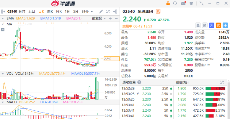6月12日讯,港股乐思集团(02540)大涨超47%,截至发稿,报2.24港元,成交额2592万港元。