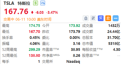 华盛资讯6月11日消息,特斯拉跌超3%,报167.76美元。消息面上,特斯拉将于北京时间6月14日凌晨举行2024年度股东大会,会上将就马斯克560亿美元的薪酬方案进行投票。多位大股东称将反对薪酬方案,其中包括第八大股东挪威主权财富基金和加州教师退休基金。