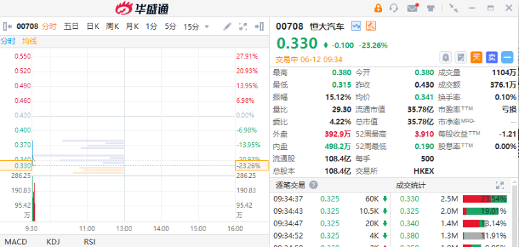 6月12日,恒大汽车(00708)早盘低开,截至发稿,跌23.26%,报0.33港元,成交额376.1万港元。