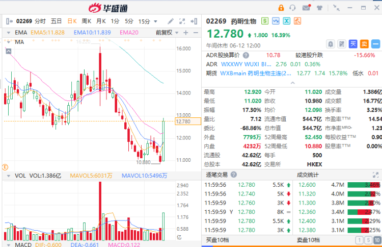6月12日|港A两地CRO板块集体拉升,其中,港股市场药明生物大涨近16%,药明康德涨9%,康龙化成涨超7%,凯莱英和方达控股涨超5%,泰格医药和金斯瑞涨近5%,昭衍新药涨超3%。