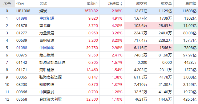 华盛资讯6月12日消息,港股煤炭股午后持续上扬,截至发稿,中煤能源涨近5%,南戈壁涨超4%,力量发展涨超3%,中国神华、蒙古焦煤涨超2%,兖矿能源、兖煤澳大利亚涨超1%。