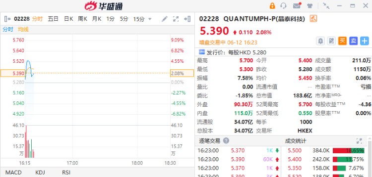 华盛资讯6月12日讯,港股晶泰科技 $02228.HK 正在暗盘交易中,股价一度涨超6%,中签一手赚320港元。截至发稿,涨超2%,最新总市值183.6亿港元。涨该股预计将于6月13日正式挂牌上市,配售结果将于今日晚间披露。