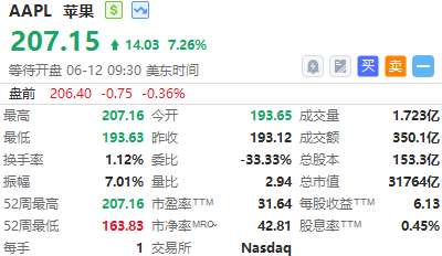 苹果周三盘前跌0.36%,全新的人工智能功能“Apple Intelligence(苹果智能)”正式亮相后首日,苹果周二股价达207.15美元/股,涨幅达7.26%,总市值为3.18万亿美元。
