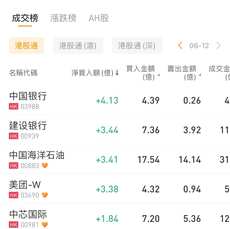 其中,南向资金净买入中国银行4.13亿港元、建设银行3.44亿港元、中国海洋石油3.41亿港元;净卖出中国宏桥0.65亿港元。
