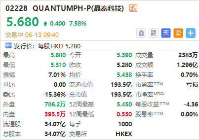 6月13日讯,港股晶泰科技QUANTUMPH-P $02228.HK 今日挂牌上市,截至发稿,涨超7%,报5.68港元,中签一手赚400港元。公司香港公开发售获103.35倍认购,一手中签率20%。