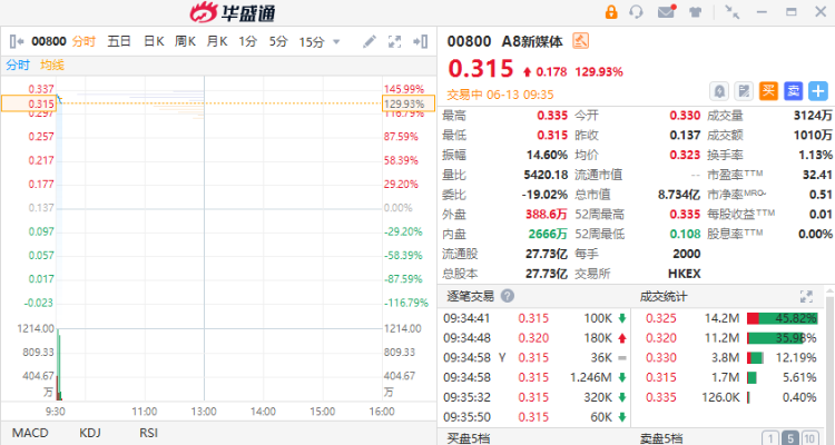 6月13日,A8新媒体(00800)复牌暴涨逾140%,截至发稿,涨129.93%,报0.315港元,成交额1010万港元。