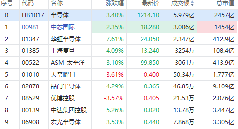 6月13日讯,港股芯片股早盘强势拉升,截至发稿,华虹半导体涨超7%,上海复旦、晶门半导体涨超4%,中芯国际涨超2%。