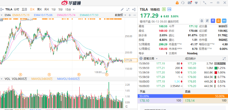 消息出来后,特斯拉夜盘交易直线拉涨超7%。隔夜,特斯拉收涨3.88%报177.29美元,总市值5654.13亿美元。