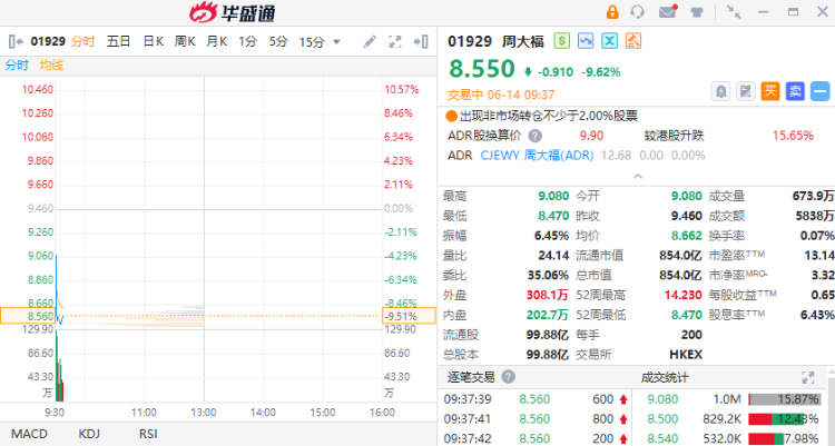 6月14日,周大福(01929)早盘低开,截至发稿,跌9.62%,报8.55港元,成交额5838万港元。