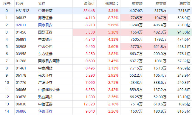 6月14日,中资券商股午后持续拉升,截至发稿,海通证券涨近9%,国泰君安、国联证券涨超5%,中国银河涨超4%,中金公司等涨超3%。