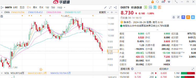 事实上,贵州茅台作为中国白酒行业的龙头企业,其股价的波动往往会对整个市场产生显著影响。近期,贵州茅台股价的调整也波及到了其他相关个股。港股上市公司珍酒李渡也出现类似走势,该公司在5月7日到6月13日期间累计下跌22.15%。