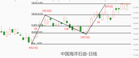 6月12日周三,中国海洋石油股价冲高至21.9港元,创出上市以来新高。在创出新高之前,K线形成明显的N型结构,6月6日突破N型高点,目前市价运行于1.382黄金分割线附近。6月份,中国海洋石油累计涨幅3.59%(月线已经连涨半年,累计涨幅超60%),同期的石油板块涨幅为1.58%,恒生指数同期下跌。石油板块展现出抗跌属性,中国海洋石油具有牛市特征,板块和个股值得持续关注。