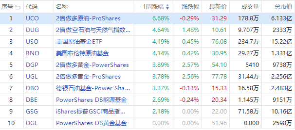 ETF涨幅榜上看:两倍做多原油ETF $UCO 周涨6.68%,原油基金ETF $USO 、 $BNO 周涨超4%;两倍做多黄金ETF $UGL 、 $DGP 涨近4%。