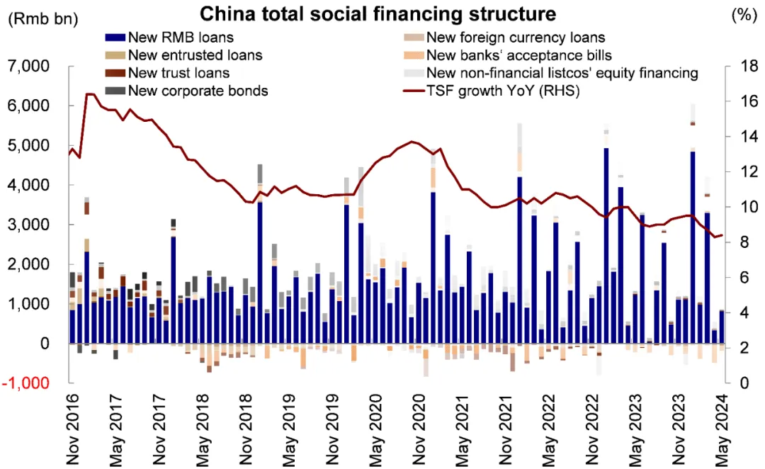 图表:中国5月金融数据不及预期,新增贷款同比少增