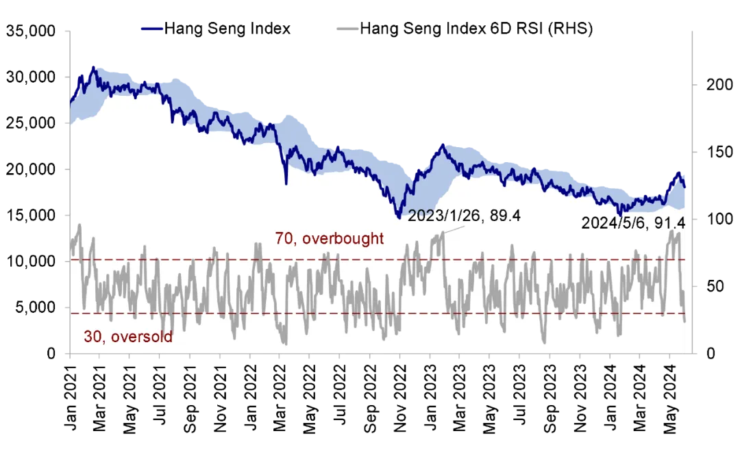 因此,我们在5月上旬以来持续提示投资者,市场已接近第一阶段目标点位,即恒指19,000-20,000点附近,对应风险溢价回落至2023年初市场高点的水平,我们认为若没有无风险利率下行和盈利大幅改善提供进一步动力,市场会面临一定获利回吐压力。