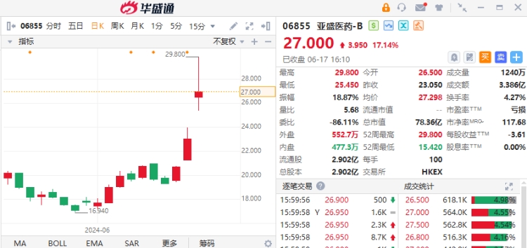 今日港股创新药公司亚盛医药(06855.HK)盘中跳涨逾20%,刷新年内高位,引发市场关注。截至收盘,该股涨超17%。