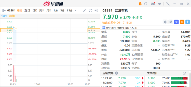 华盛资讯06月17日讯,港股武汉有机正在暗盘交易中,截至发稿涨44.91%,报7.97港元/股,中签一手账面浮盈1235港元,最新总市值超7.4亿港元。该股预计将于6月18日正式挂牌上市,配售结果将于今日晚间披露。