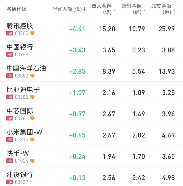 南下资金今日净买入腾讯4.4亿港元、中国银行3.43亿港元、中海油2.85亿港元;净卖出华晨中国2.4亿港元、美团1.79亿港元。