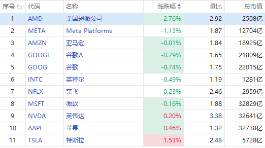 明星科技股多数走低,截至发稿,AMD $AMD 跌近3%,Meta $META 跌超1%,亚马逊、谷歌跌近1%。