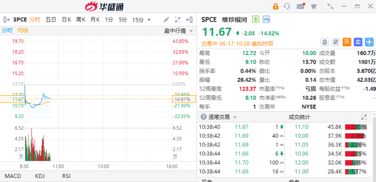 维珍银河跌近15%,消息面上,维珍银河董事会此前批准进行1:20的反向拆股,以满足继续在纽约证券交易所上市的最低股价要求。反向拆股已于上周五收市后生效。