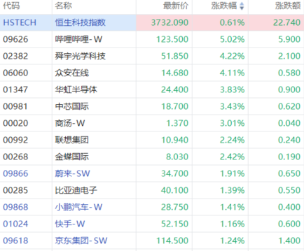 科网股中,哔哩哔哩-W涨超5%,舜宇光学科技、中芯国际涨超4%,蔚来、快手、京东、小鹏汽车涨超1%,小米、阿里巴巴、腾讯跟涨。