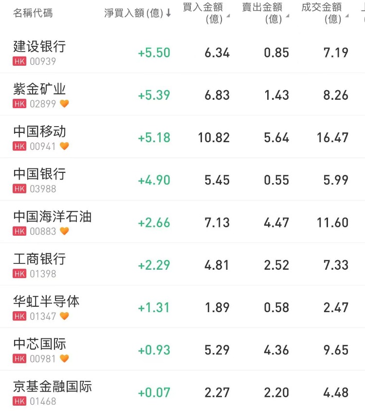 南下资金今日净买入建设银行5.5亿港元、紫金矿业5.39亿港元、中国移动5.18亿港元;净卖出腾讯2.75亿港元。