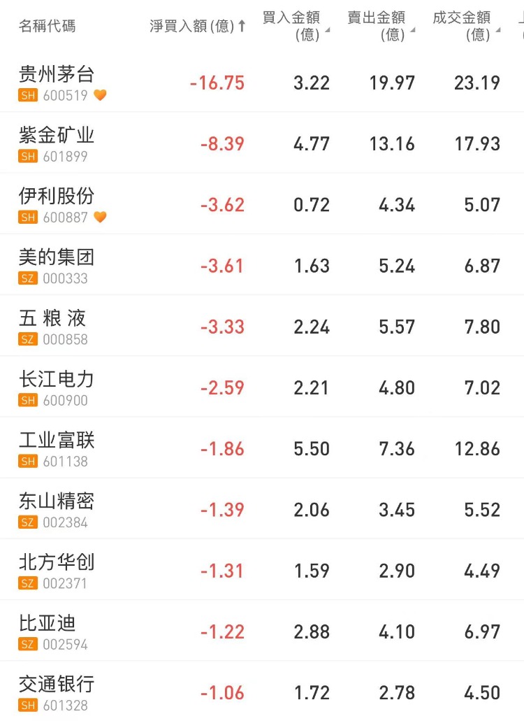 北上资金今日净卖出A股23.12亿元,为连续第7日净卖出。其中,贵州茅台、紫金矿业、伊利股份分别遭净卖出16.75亿元、8.39亿元、3.62亿元;立讯精密、新易盛、赛力斯分别获逆势净买入6.56亿元、3.86亿元、3.24亿元。
