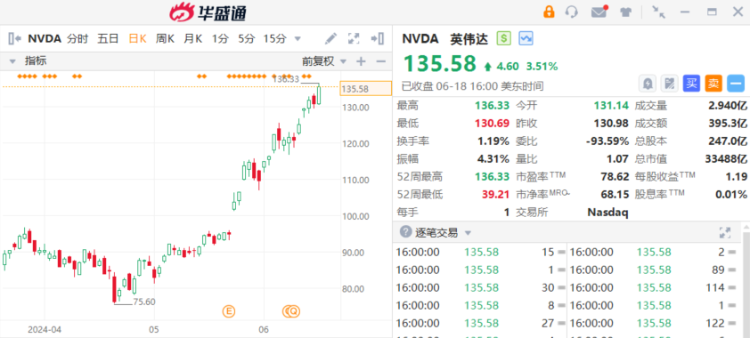 同时栢能集团旗下索泰的合作伙伴英伟达成为全球最高市值股票。截至收盘,英伟达股价上涨3.51%,报135.58美元再刷历史新高,总市值达3.335万亿美元。这也带动了栢能集团。