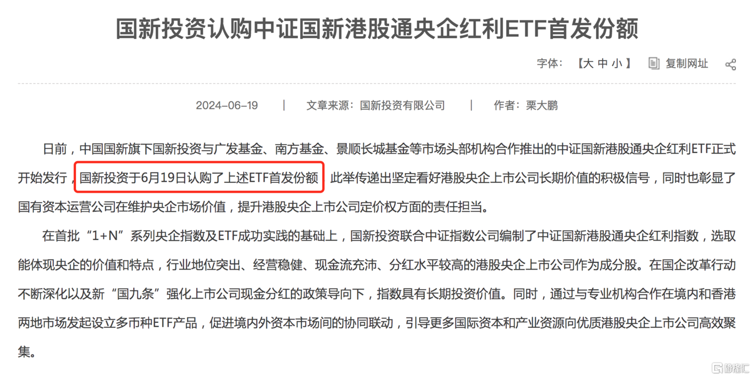 国新投资在官网宣布,今天认购了广发、南方、景顺长城等基金公司旗下在发的首批中证国新港股通央企红利ETF。