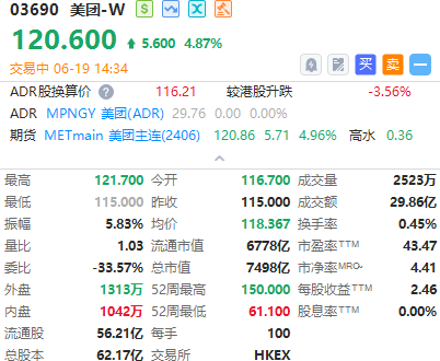 美团-W(03690)午后涨超4%,截至发稿,涨4.78%,报120.5港元,成交额29.86亿港元。