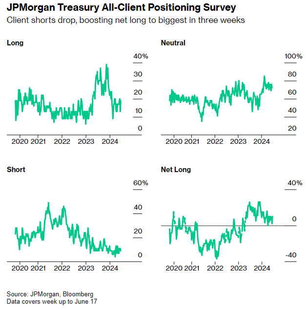 现货市场也出现了相关迹象,摩根大通的一项调查显示,美债净多头头寸达到了大约一个月来的最高水平。截至6月17日当周,摩根大通的美债客户调查显示,多头仓位上升了6个百分点,推动整体客户的净多头仓位升至5月20日以来的最高水平。直接空头仓位当周下降了2个百分点,中性仓位下降了4个百分点。