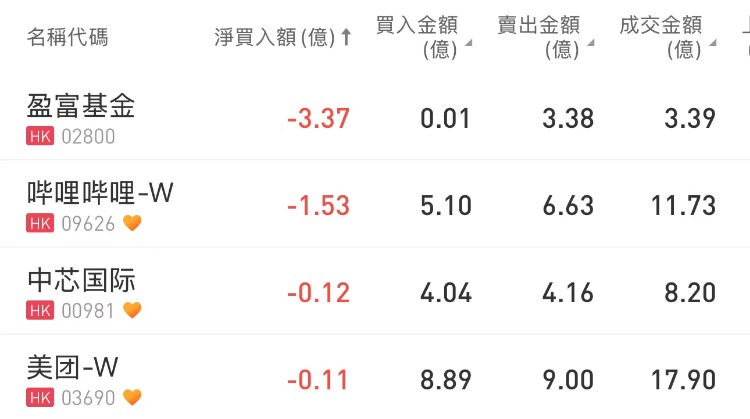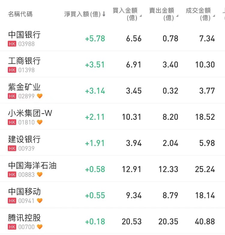 南下资金今日净买入中国银行5.78亿港元、工商银行3.51亿港元、紫金矿业3.14亿港元;净卖出盈富基金3.37亿港元。